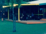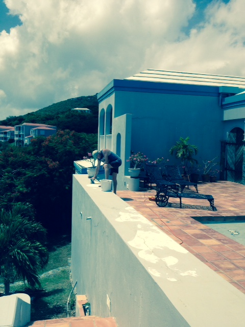 One assigned project is to keep the concrete walls around the patios painted and touched up before guests arrive and/or after weddings and events. Due to the heat, the flat surfaces of these walls get extremely hot causing the paint to blister in areas. So …. before you can paint, you have to cut out the blisters and peel off the paint where it is not adhering. That’s one project we did this weekend. And Sharon decided to use the time in the sun to work on her tan. Ergo the title: Peeling, Painting, and Bikini.